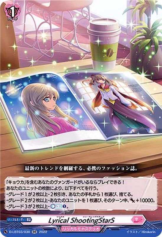 「キョウカ」を含むあなたのヴァンガードがいるならプレイできる!あなたのユニットの枚数により、以下すべてを行う。・グレード1が2枚以上-2枚引き、あなたの手札から1枚選び、捨てる。・グレード2が2枚以上-あなたのユニットを1枚選び、そのターン中、パワー+10000。・グレード3が2枚以上-【カウンターチャージ】(1)。
