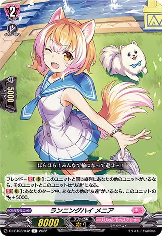 フレンド-【永】【(R)】:このユニットと同じ縦列にあなたの他のユニットがいるなら、そのユニットとこのユニットは“友達”になる。【永】【(R)】:あなたのターン中、あなたの他の“友達”がいるなら、このユニットのパワー+5000。