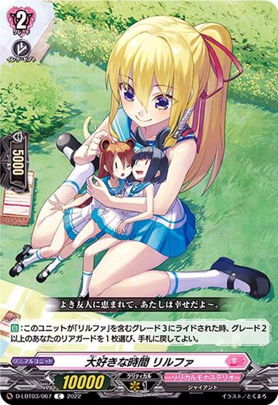 【自】:このユニットが「リルファ」を含むグレード3にライドされた時、グレード2以上のあなたのリアガードを1枚選び、手札に戻してよい。