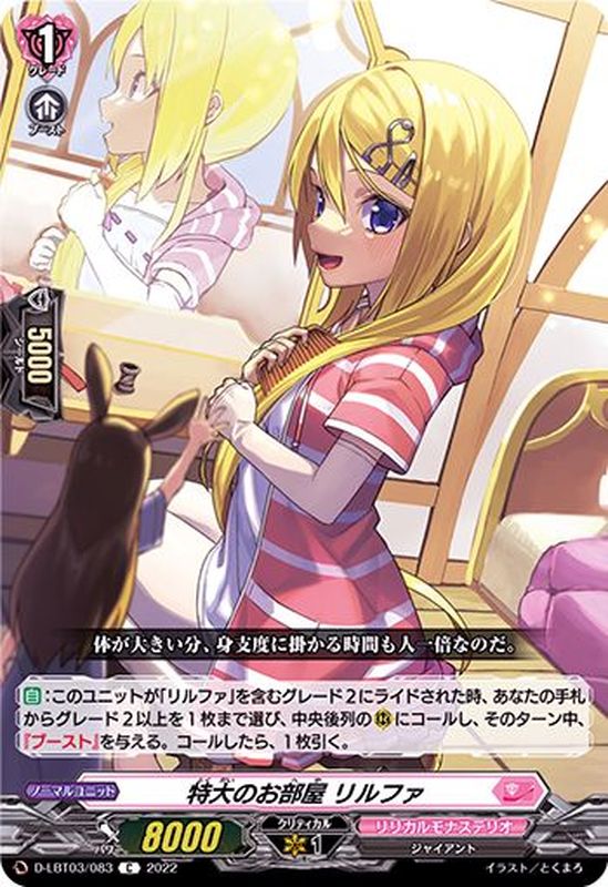 【自】:このユニットが「リルファ」を含むグレード2にライドされた時、あなたの手札からグレード2以上を1枚まで選び、中央後列の(R)にコールし、そのターン中、『ブースト』を与える。コールしたら、1枚引く。