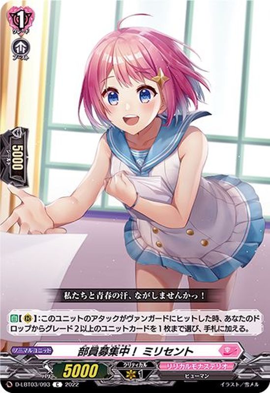 【自】【(R)】:このユニットのアタックがヴァンガードにヒットした時、あなたのドロップからグレード2以上のユニットカードを1枚まで選び、手札に加える。