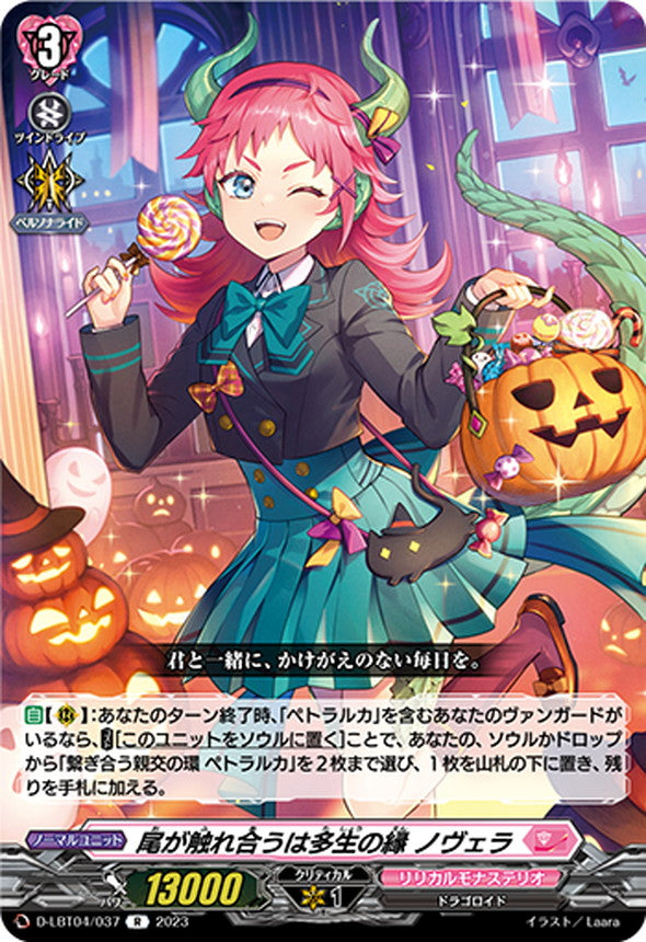 【自】【(R)】:あなたのターン終了時、「ペトラルカ」を含むあなたのヴァンガードがいるなら、【コスト】[このユニットをソウルに置く]ことで、あなたの、ソウルかドロップから「繋ぎ合う親交の環 ペトラルカ」を2枚まで選び、1枚を山札の下に置き、残りを手札に加える。