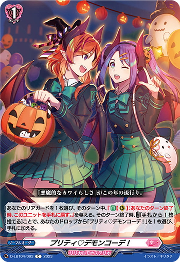 あなたのリアガードを1枚選び、そのターン中、『【自】【(R)】:あなたのターン終了時、このユニットを手札に戻す。』を与える。そのターン終了時、【コスト】[手札から1枚捨てる]ことで、あなたのドロップから「プリティ♡デモンコーデ!」を1枚選び、手札に加える。