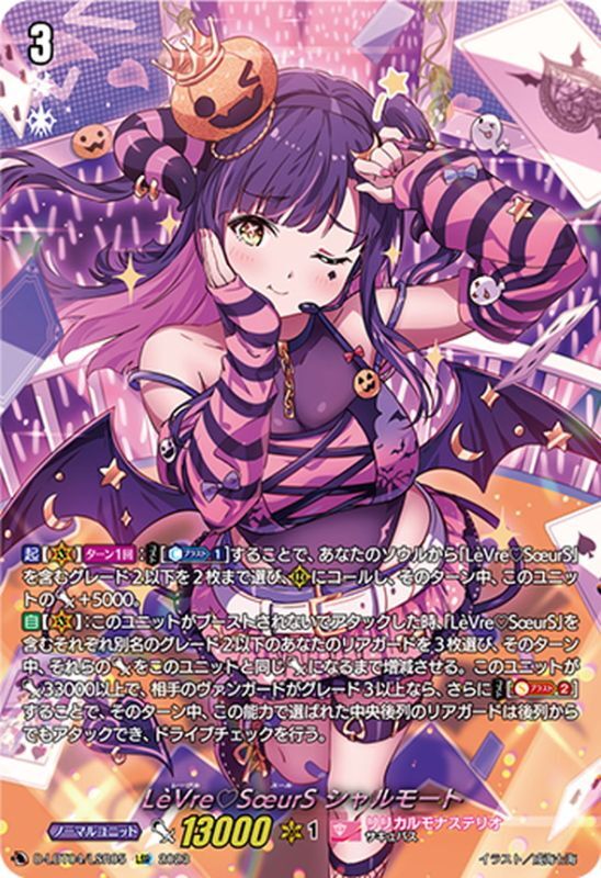 【起】【(V)】【ターン1回】:【コスト】[【カウンターブラスト】(1)]することで、あなたのソウルから「LèVre♡SœurS」を含むグレード2以下を2枚まで選び、(R)にコールし、そのターン中、このユニットのパワー+5000。【自】【(V)】:このユニットがブーストされないでアタックした時、「LèVre♡SœurS」を含むそれぞれ別名のグレード2以下のあなたのリアガードを3枚選び、そのターン中、それらのパワーをこのユニットと同じパワーになるまで増減させる。このユニットがパワー33000以上で、相手のヴァンガードがグレード3以上なら、さらに【コスト】[【ソウルブラスト】(2)]することで、そのターン中、この能力で選ばれた中央後列のリアガードは後列からでもアタックでき、ドライブチェックを行う。