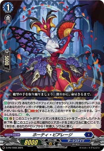 【自】【ドロップ】:あなたのライドフェイズに「オセラジェスト」を含むグレード3以上のあなたのヴァンガードが登場した時、このカードと同名のあなたのリアガードがいないなら、【コスト】[【ソウルブラスト】(1)]することで、このカードを(R)にコールする。コールしたなら、【エネルギーチャージ】(1)。【自】【(R)】:このユニットが「ティリガン」を含むユニットをブーストしたバトル終了時、【コスト】[このユニットと同じ縦列のリアガードを2枚ソウルに置く]ことで、1枚引き、あなたのドロップから1枚選び、ソウルに置く。