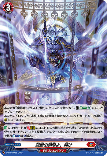 あなたが「魔忍竜 シラヌイ “朧”」のクレストを持つなら、【コスト】[【エネルギーブラスト】(3)]することでプレイできる!あなたのドロップから「忍」を含む守護者を持たないユニットカードを1枚選び、(R)にコールする。【自】:このカードが【超越】のコストを払う際に手札から捨てられた時、あなたの、ヴァンガードかハーツを1枚選び、そのターン中、次にそのカードの能力のコストで払う【カウンターブラスト】は(1)減る。