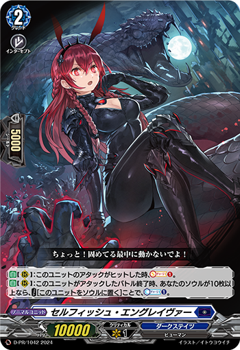 【自】【(R)】:このユニットのアタックがヒットした時、【ソウルチャージ】(1)。【自】【(R)】:このユニットがアタックしたバトル終了時、あなたのソウルが10枚以上なら、【コスト】[このユニットをソウルに置く]ことで、【カウンターチャージ】(1)。