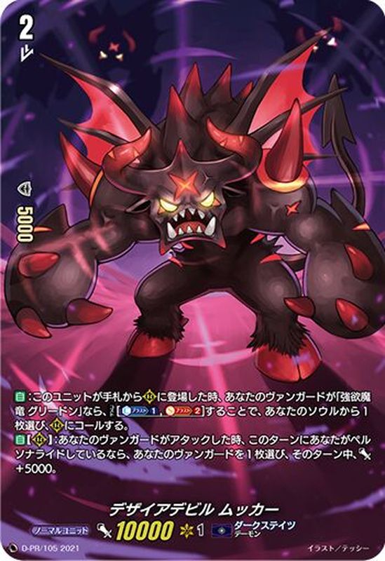 【自】:このユニットが手札から(R)に登場した時、あなたのヴァンガードが「強欲魔竜 グリードン」なら、【コスト】[【カウンターブラスト】(1),【ソウルブラスト】(2)]することで、あなたのソウルから1枚選び、(R)にコールする。【自】【(R)】:あなたのヴァンガードがアタックした時、このターンにあなたがペルソナライドしているなら、あなたのヴァンガードを1枚選び、そのターン中、パワー+5000。