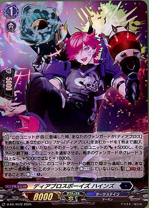 【自】:このユニットが(R)に登場した時、あなたのヴァンガードが「ディアブロス」を含むなら、あなたのドロップから「ディアブロス」を含むカードを1枚まで選び、ソウルに置く。置いたなら、そのターン中、このユニットのパワー+5000し、そのターン終了時、このユニットを退却させる。相手のヴァンガードがグレード3以上なら、+5000ではなく+10000。