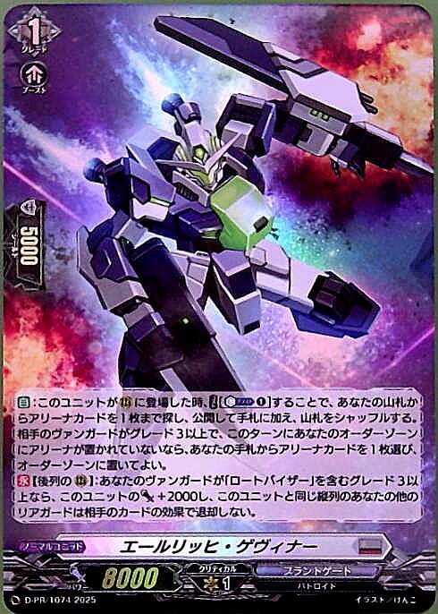 【自】:このユニットが(R)に登場した時、【コスト】[【カウンターブラスト】(1)]することで、あなたの山札からアリーナカードを1枚まで探し、公開して手札に加え、山札をシャッフルする。相手のヴァンガードがグレード3以上で、このターンにあなたのオーダーゾーンにアリーナが置かれていないなら、あなたの手札からアリーナカードを1枚選び、オーダーゾーンに置いてよい。