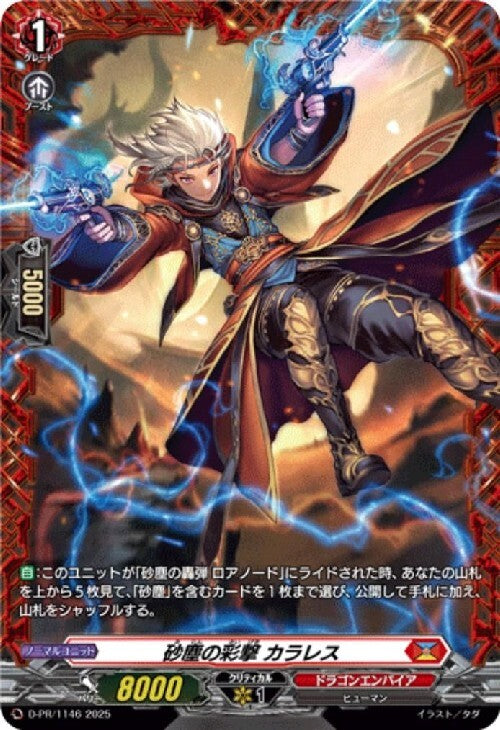 【自】:このユニットが「砂塵の轟弾 ロアノード」にライドされた時、あなたの山札を上から5枚見て、「砂塵」を含むカードを1枚まで選び、公開して手札に加え、山札をシャッフルする。
