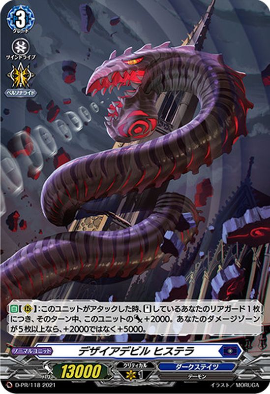【自】【(R)】:このユニットがアタックした時、【スタンド】しているあなたのリアガード1枚につき、そのターン中、このユニットのパワー+2000。あなたのダメージゾーンが5枚以上なら、+2000ではなく+5000。