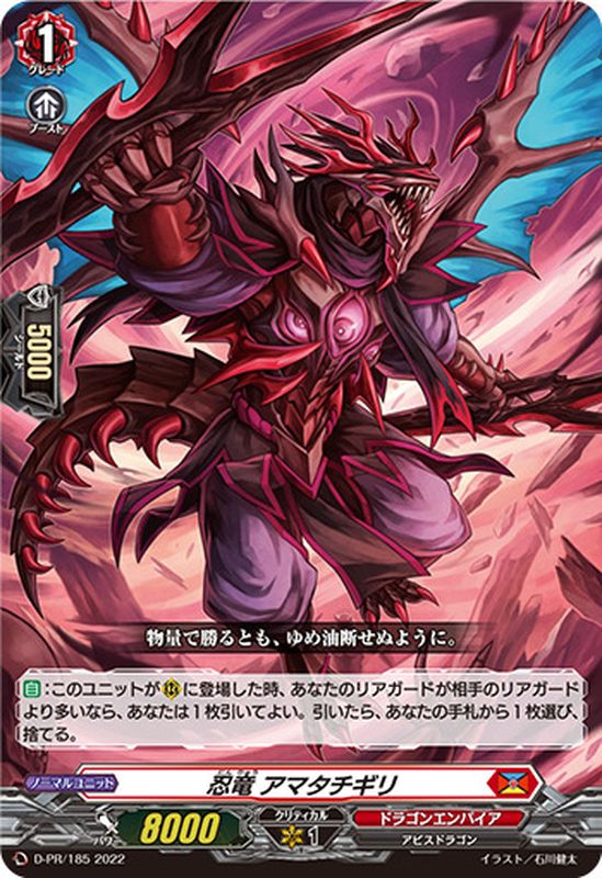 【自】:このユニットが(R)に登場した時、あなたのリアガードが相手のリアガードより多いなら、あなたは1枚引いてよい。引いたら、あなたの手札から1枚選び、捨てる。
