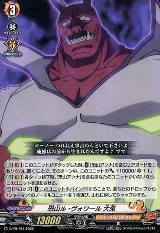 【自】【(R)】:このユニットがアタックした時、【コスト】[「恐山アンナ」を含むリアガードを1枚ソウルに置く]ことで、そのターン中、このユニットのパワー+10000/クリティカル+1。【自】【(R)】:各ターン終了時、「恐山アンナ」を含むあなたのユニットがいないなら、このユニットを退却させる。【起】【ドロップ】:【コスト】[このユニットをバインド]することで、あなたのドロップから〈シャーマン〉のノーマルユニットを1枚選び、山札に戻してシャッフルする。