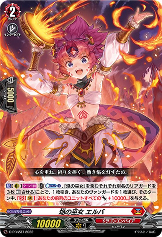 【起】【(R)】【ターン1回】:【コスト】[【カウンターブラスト】(1),「焔の巫女」を含むそれぞれ別名のリアガードを3枚【レスト】させる]ことで、1枚引き、あなたのヴァンガードを1枚選び、そのターン中、『【永】【(V)】:あなたの前列のユニットすべてのパワー+10000。』を与える。