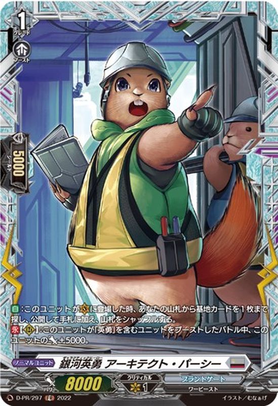 【自】:このユニットが(V)に登場した時、あなたの山札から基地カードを1枚まで探し、公開して手札に加え、山札をシャッフルする。【永】【(R)】:このユニットが「英勇」を含むユニットをブーストしたバトル中、このユニットのパワー+5000。