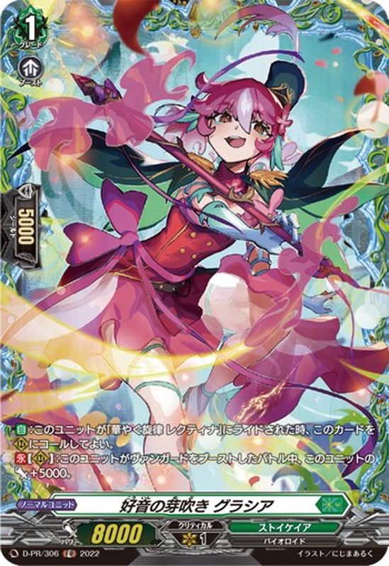 【自】:このユニットが「華やぐ旋律 レクティナ」にライドされた時、このカードを(R)にコールしてよい。【永】【(R)】:このユニットがヴァンガードをブーストしたバトル中、このユニットのパワー+5000。
