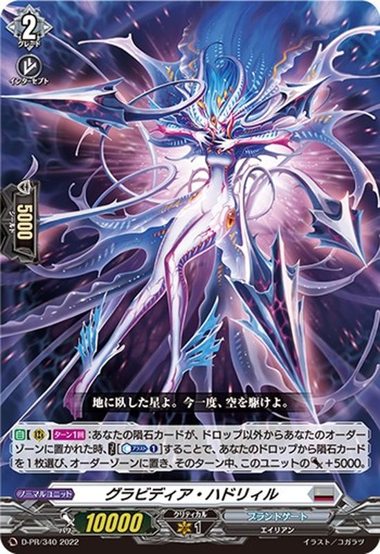 【自】【(R)】【ターン1回】:あなたの隕石カードが、ドロップ以外からあなたのオーダーゾーンに置かれた時、【コスト】[【カウンターブラスト】(1)]することで、あなたのドロップから隕石カードを1枚選び、オーダーゾーンに置き、そのターン中、このユニットのパワー+5000。