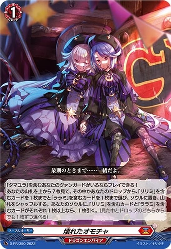 「タマユラ」を含むあなたのヴァンガードがいるならプレイできる!あなたの山札を上から7枚見て、その中かあなたのドロップから、「リリミ」を含むカードを1枚までと「ララミ」を含むカードを1枚まで選び、ソウルに置き、山札をシャッフルする。あなたのソウルに、「リリミ」を含むカードと「ララミ」を含むカードがそれぞれ1枚以上なら、1枚引く。(見た中とドロップのどちらからでも1枚ずつ選べる)