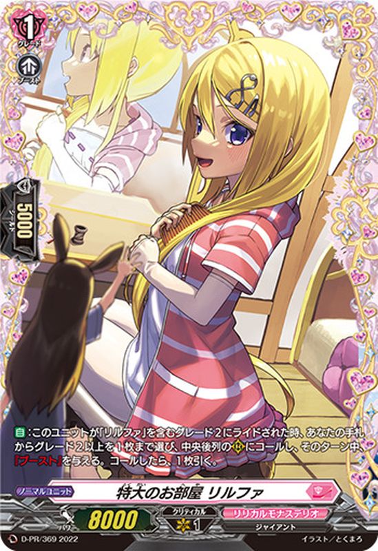 【自】:このユニットが「リルファ」を含むグレード2にライドされた時、あなたの手札からグレード2以上を1枚まで選び、中央後列の(R)にコールし、そのターン中、『ブースト』を与える。コールしたら、1枚引く。