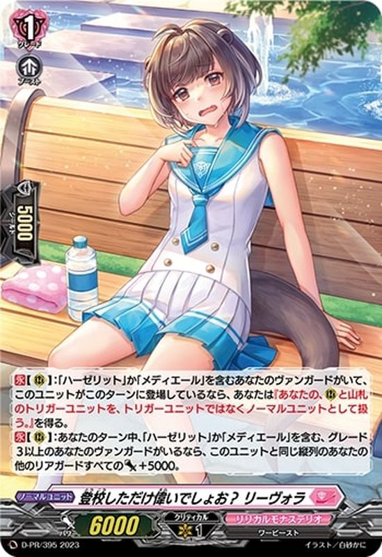 【永】【(R)】:「ハーゼリット」か「メディエール」を含むあなたのヴァンガードがいて、このユニットがこのターンに登場しているなら、あなたは『あなたの、(R)と山札のトリガーユニットを、トリガーユニットではなくノーマルユニットとして扱う。』を得る。【永】【(R)】:あなたのターン中、「ハーゼリット」か「メディエール」を含む、グレード3以上のあなたのヴァンガードがいるなら、このユニットと同じ縦列のあなたの他のリアガードすべてのパワー+5000。