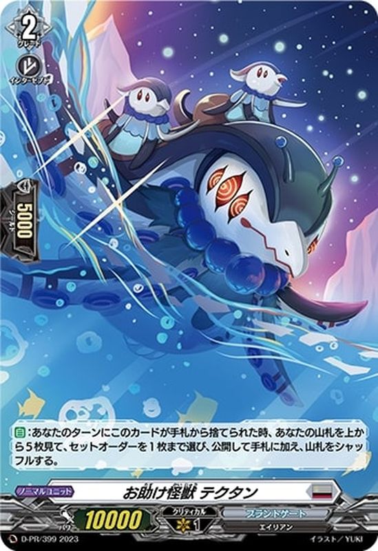 【自】:あなたのターンにこのカードが手札から捨てられた時、あなたの山札を上から5枚見て、セットオーダーを1枚まで選び、公開して手札に加え、山札をシャッフルする。