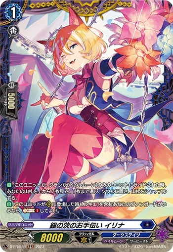 【自】:このユニットが、クランが《ペイルムーン》のみのユニットにライドされた時、あなたの山札を上から7枚見て、1枚まで選び、ソウルに置き、山札をシャッフルする。【自】:このユニットが(R)に登場した時、「ルキエ」を含むあなたのヴァンガードがいるなら、【ソウルチャージ】(1)してよい。