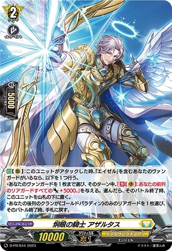 【自】【(R)】:このユニットがアタックした時、「エイゼル」を含むあなたのヴァンガードがいるなら、以下を1つ行う。・あなたのヴァンガードを1枚まで選び、そのターン中、『【永】【(V)】:あなたの前列のリアガードすべてのパワー+5000。』を与える。選んだら、そのバトル終了時、このユニットを山札の下に置く。・あなたの後列のクランが《ゴールドパラディン》のみのリアガードを1枚選び、そのバトル終了時、手札に戻す。