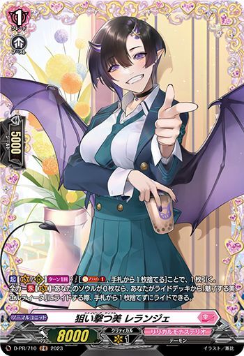【起】【(V)/(R)】【ターン1回】:【コスト】[【ソウルブラスト】(1),手札から1枚捨てる]ことで、1枚引く。全力-【永】【(V)】:あなたのソウルが0枚なら、あなたがライドデッキから「魅了する美 エルティーヌ」にライドする際、手札から1枚捨てずにライドできる。