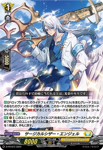 【自】【ドロップ】:あなたのライドフェイズに「ザレヴサエル」を含むグレード3以上のあなたのヴァンガードが登場した時、このカードと同名のあなたのリアガードがいないなら、【コスト】[【ソウルブラスト】(1)]することで、このカードを(R)にコールする。コールしたなら、【エネルギーチャージ】(1)。【自】【(R)】:このユニットが「ヴィライルコア」を含むユニットをブーストしたバトル終了時、【コスト】[このユニットをソウルに置く]ことで、そのブーストされたリアガードを1枚選び、手札に戻す。