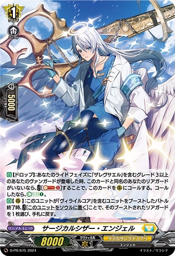 【自】【ドロップ】:あなたのライドフェイズに「ザレヴサエル」を含むグレード3以上のあなたのヴァンガードが登場した時、このカードと同名のあなたのリアガードがいないなら、【コスト】[【ソウルブラスト】(1)]することで、このカードを(R)にコールする。コールしたなら、【エネルギーチャージ】(1)。【自】【(R)】:このユニットが「ヴィライルコア」を含むユニットをブーストしたバトル終了時、【コスト】[このユニットをソウルに置く]ことで、そのブーストされたリアガードを1枚選び、手札に戻す。