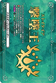 【自】【ライドデッキ】:あなたがライドした時、このカードをクレストゾーンに置き、あなたが後攻なら、【エネルギーチャージ】(3)。【永】:あなたはエネルギーを10個まで持てる。【自】:あなたのライドフェイズ開始時、【エネルギーチャージ】(3)。【起】【ターン1回】:【コスト】[【エネルギーブラスト】(7)]することで、1枚引く。