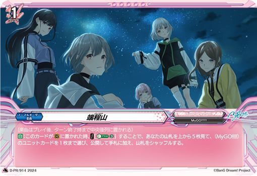 (楽曲はプレイ後、ターン終了時まで中央後列に置かれる)【自】:このカードが(R)に置かれた時、【コスト】[【エネルギーブラスト】(3)]することで、あなたの山札を上から5枚見て、〈MyGO!!!!!〉のユニットカードを1枚まで選び、公開して手札に加え、山札をシャッフルする。