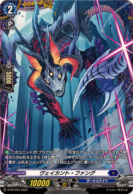 【自】:このユニットが「ブラグドマイヤー」を含むグレード3にライドされた時、あなたの山札を上から3枚公開し、その中からグレード1以上すべてをソウルに置き、山札をシャッフルする。2枚以上ソウルに置いたなら、1枚引く。