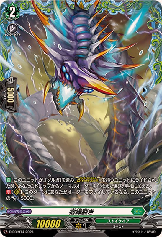【自】:このユニットが、「ゾルガ」を含み【ディヴァインスキル】を持つユニットにライドされた時、あなたのドロップからノーマルオーダーを1枚まで選び、手札に加える。【永】【(R)】:このターンにあなたがオーダーをプレイしているなら、このユニットのパワー+5000。