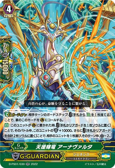 【Gガーディアン】-相手ターンのガードステップ-【コスト】[手札から【治】を1枚捨てる]ことで、裏のこのカードを(G)にコールする。【自】:このユニットが(G)に置かれた時、【コスト】[手札かリアガードを1枚ソウルに置く]ことで、そのバトル中、このユニットのシールド+10000。さらに【コスト】[手札かリアガードを合計2枚ソウルに置く]ことで、相手のユニットを1枚選び、そのターン中、クリティカル-2。