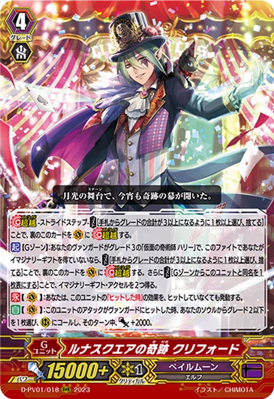 【超越】-ストライドステップ-【コスト】[手札からグレードの合計が3以上になるように1枚以上選び、捨てる]ことで、裏のこのカードを(V)に【超越】する。【起】【Gゾーン】:あなたのヴァンガードがグレード3の「仮面の奇術師 ハリー」で、このファイトであなたがイマジナリーギフトを得ていないなら、【コスト】[手札からグレードの合計が3以上になるように1枚以上選び、捨てる]ことで、裏のこのカードを(V)に【超越】する。さらに【コスト】[Gゾーンからこのユニットと同名を1枚表にする]ことで、イマジナリーギフト・アクセルを2つ得る。【永】【(V)】:あなたは、このユニットの『ヒットした時』の効果を、ヒットしていなくても発動する。【自】【(V)】:このユニットのアタックがヴァンガードにヒットした時、あなたのソウルからグレード2以下を1枚選び、(R)にコールし、そのターン中、パワー+2000。
