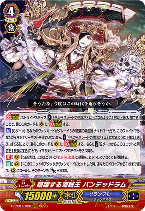 【超越】-ストライドステップ-【コスト】[手札からグレードの合計が3以上になるように1枚以上選び、捨てる]ことで、裏のこのカードを(V)に【超越】する。【起】【Gゾーン】:あなたのヴァンガードがグレード3の「夜霧の吸血姫 ナイトローゼ」で、このファイトであなたがイマジナリーギフトを得ていないなら、【コスト】[手札からグレードの合計が3以上になるように1枚以上選び、捨てる]ことで、裏のこのカードを(V)に【超越】する。さらに【コスト】[Gゾーンからこのユニットと同名を1枚表にする]ことで、イマジナリーギフト・プロテクトを2つ得る。【永】【(V)】:あなたは、このユニットの『ヒットした時』の効果を、ヒットしていなくても発動する。【自】【(V)】:このユニットのアタックがヴァンガードにヒットした時、あなたのドロップから1枚まで選び、(R)にコールし、そのターン中、パワー+2000。