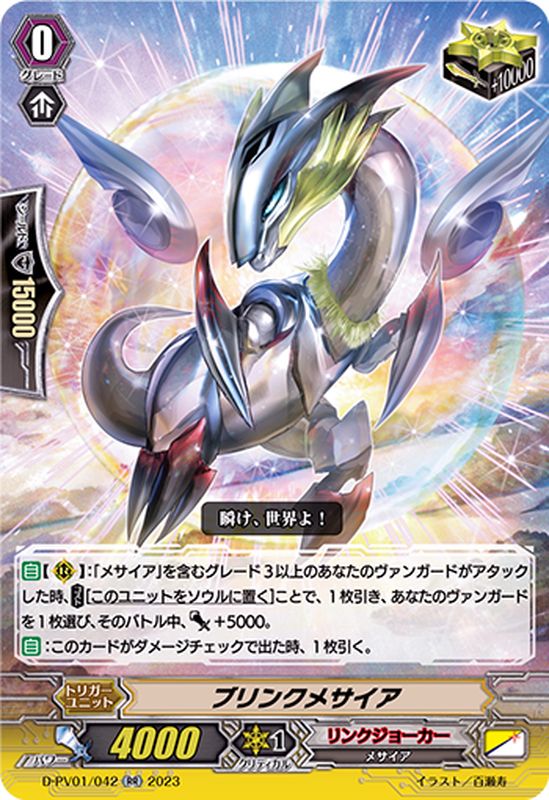 【自】【(R)】:「メサイア」を含むグレード3以上のあなたのヴァンガードがアタックした時、【コスト】[このユニットをソウルに置く]ことで、1枚引き、あなたのヴァンガードを1枚選び、そのバトル中、パワー+5000。【自】:このカードがダメージチェックで出た時、1枚引く。