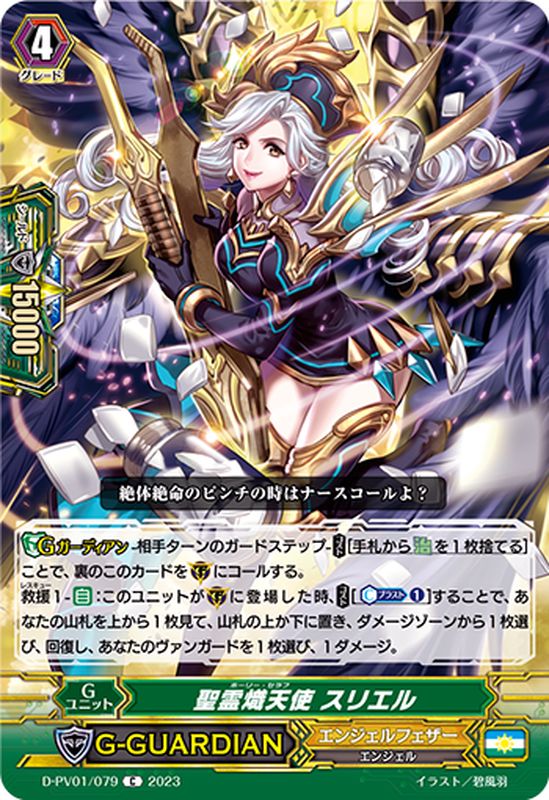 【Gガーディアン】-相手ターンのガードステップ-【コスト】[手札から【治】を1枚捨てる]ことで、裏のこのカードを(G)にコールする。救援1-【自】:このユニットが(G)に登場した時、【コスト】[【カウンターブラスト】(1)]することで、あなたの山札を上から1枚見て、山札の上か下に置き、ダメージゾーンから1枚選び、回復し、あなたのヴァンガードを1枚選び、1ダメージ。