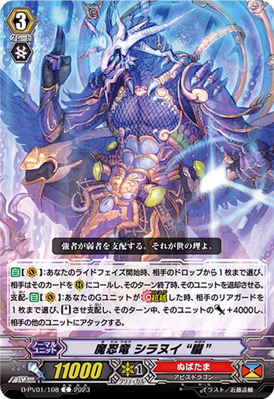 【自】【(V)】:あなたのライドフェイズ開始時、相手のドロップから1枚まで選び、相手はそのカードを(R)にコールし、そのターン終了時、そのユニットを退却させる。支配-【自】【(V)】:あなたのGユニットが【超越】した時、相手のリアガードを1枚まで選び、【スタンド】させ支配し、そのターン中、そのユニットのパワー+4000し、相手の他のユニットにアタックする。