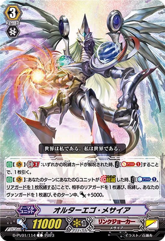 【自】【(V)】【Gブレイク】(2):いずれかの呪縛カードが解呪された時、【コスト】[【ソウルブラスト】(1)]することで、1枚引く。【自】【(V)】:あなたのターンにあなたのGユニットが【超越】した時、【コスト】[【カウンターブラスト】(1),リアガードを1枚呪縛する]ことで、相手のリアガードを1枚選び、呪縛し、あなたのヴァンガードを1枚選び、そのターン中、パワー+5000。