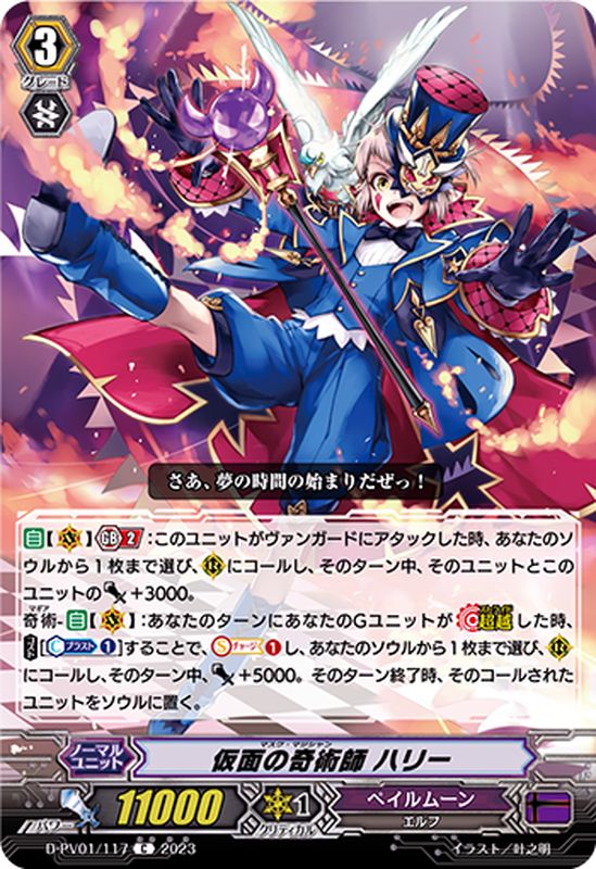 【自】【(V)】【Gブレイク】(2):このユニットがヴァンガードにアタックした時、あなたのソウルから1枚まで選び、(R)にコールし、そのターン中、そのユニットとこのユニットのパワー+3000。奇術-【自】【(V)】:あなたのターンにあなたのGユニットが【超越】した時、【コスト】[【カウンターブラスト】(1)]することで、【ソウルチャージ】(1)し、あなたのソウルから1枚まで選び、(R)にコールし、そのターン中、パワー+5000。そのターン終了時、そのコールされたユニットをソウルに置く。