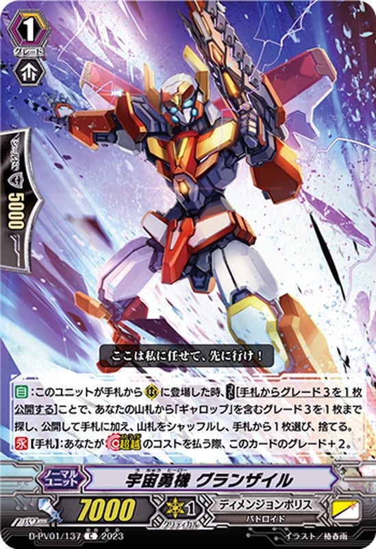 【自】:このユニットが手札から(R)に登場した時、【コスト】[手札からグレード3を1枚公開する]ことで、あなたの山札から「ギャロップ」を含むグレード3を1枚まで探し、公開して手札に加え、山札をシャッフルし、手札から1枚選び、捨てる。【永】【手札】:あなたが【超越】のコストを払う際、このカードのグレード+2。