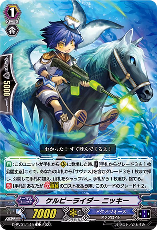 【自】:このユニットが手札から(R)に登場した時、【コスト】[手札からグレード3を1枚公開する]ことで、あなたの山札から「サヴァス」を含むグレード3を1枚まで探し、公開して手札に加え、山札をシャッフルし、手札から1枚選び、捨てる。【永】【手札】:あなたが【超越】のコストを払う際、このカードのグレード+2。
