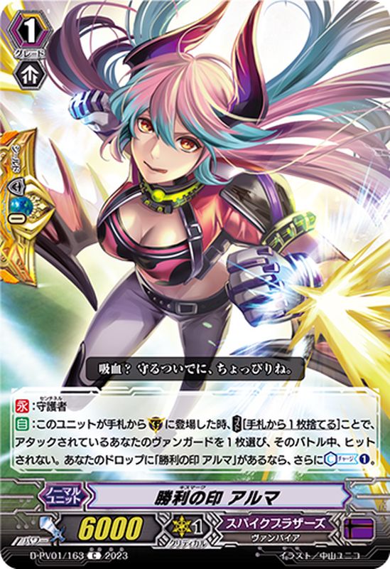 【永】:守護者【自】:このユニットが手札から(G)に登場した時、【コスト】[手札から1枚捨てる]ことで、アタックされているあなたのヴァンガードを1枚選び、そのバトル中、ヒットされない。あなたのドロップに「勝利の印 アルマ」があるなら、さらに【カウンターチャージ】(1)。