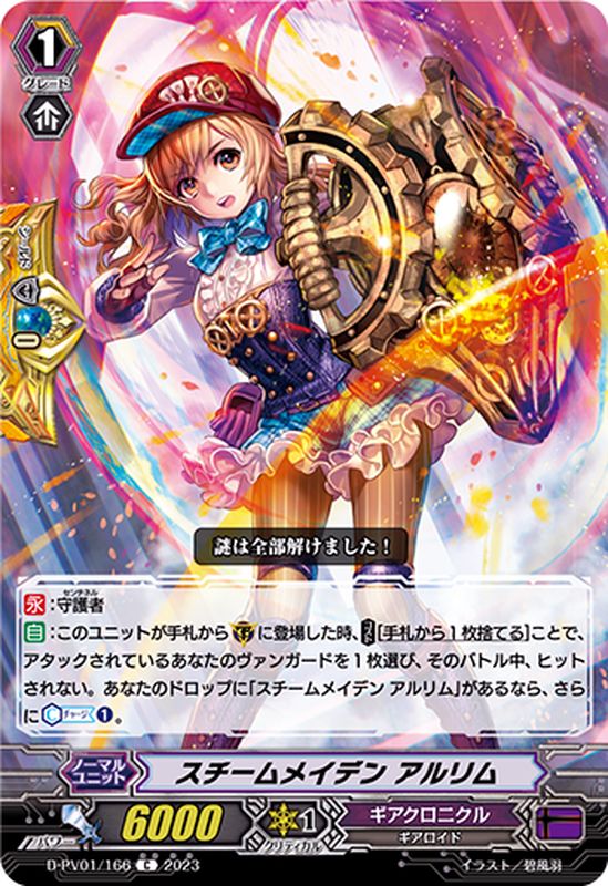 【永】:守護者【自】:このユニットが手札から(G)に登場した時、【コスト】[手札から1枚捨てる]ことで、アタックされているあなたのヴァンガードを1枚選び、そのバトル中、ヒットされない。あなたのドロップに「スチームメイデン アルリム」があるなら、さらに【カウンターチャージ】(1)。