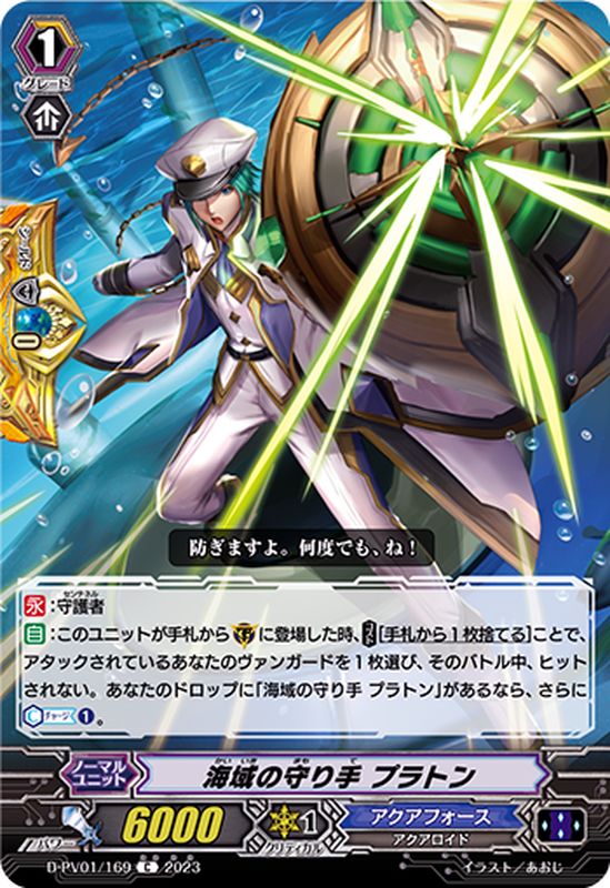 【永】:守護者【自】:このユニットが手札から(G)に登場した時、【コスト】[手札から1枚捨てる]ことで、アタックされているあなたのヴァンガードを1枚選び、そのバトル中、ヒットされない。あなたのドロップに「海域の守り手 プラトン」があるなら、さらに【カウンターチャージ】(1)。