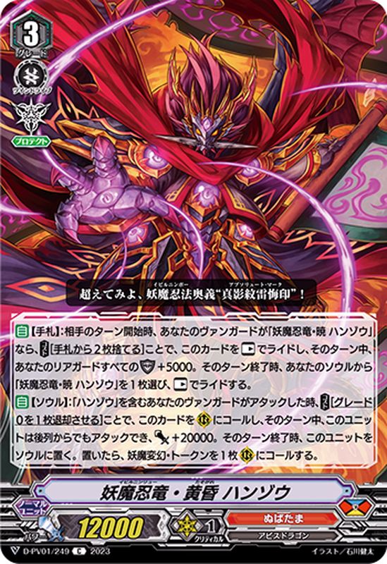 【自】【手札】:相手のターン開始時、あなたのヴァンガードが「妖魔忍竜・暁 ハンゾウ」なら、【コスト】[手札から2枚捨てる]ことで、このカードを【レスト】でライドし、そのターン中、あなたのリアガードすべてのシールド+5000。そのターン終了時、あなたのソウルから「妖魔忍竜・暁 ハンゾウ」を1枚選び、【レスト】でライドする。【自】【ソウル】:「ハンゾウ」を含むあなたのヴァンガードがアタックした時、【コスト】[グレード0を1枚退却させる]ことで、このカードを(R)にコールし、そのターン中、このユニットは後列からでもアタックでき、パワー+20000。そのターン終了時、このユニットをソウルに置く。置いたら、妖魔変幻・トークンを1枚(R)にコールする。