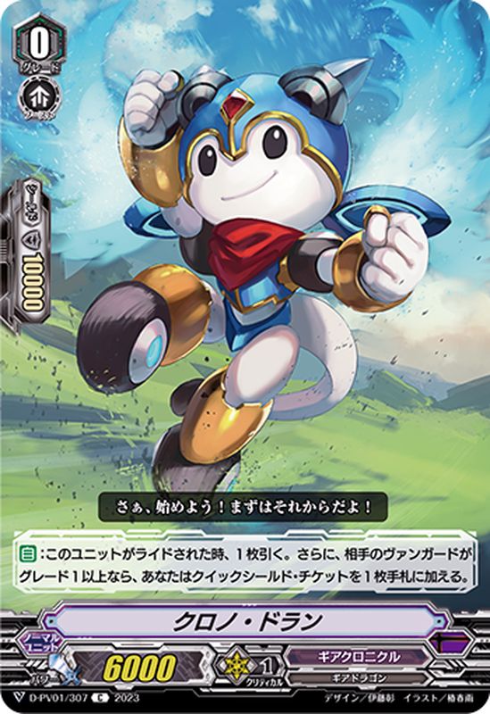 【自】:このユニットがライドされた時、1枚引く。さらに、相手のヴァンガードがグレード1以上なら、あなたはクイックシールド・チケットを1枚手札に加える。
